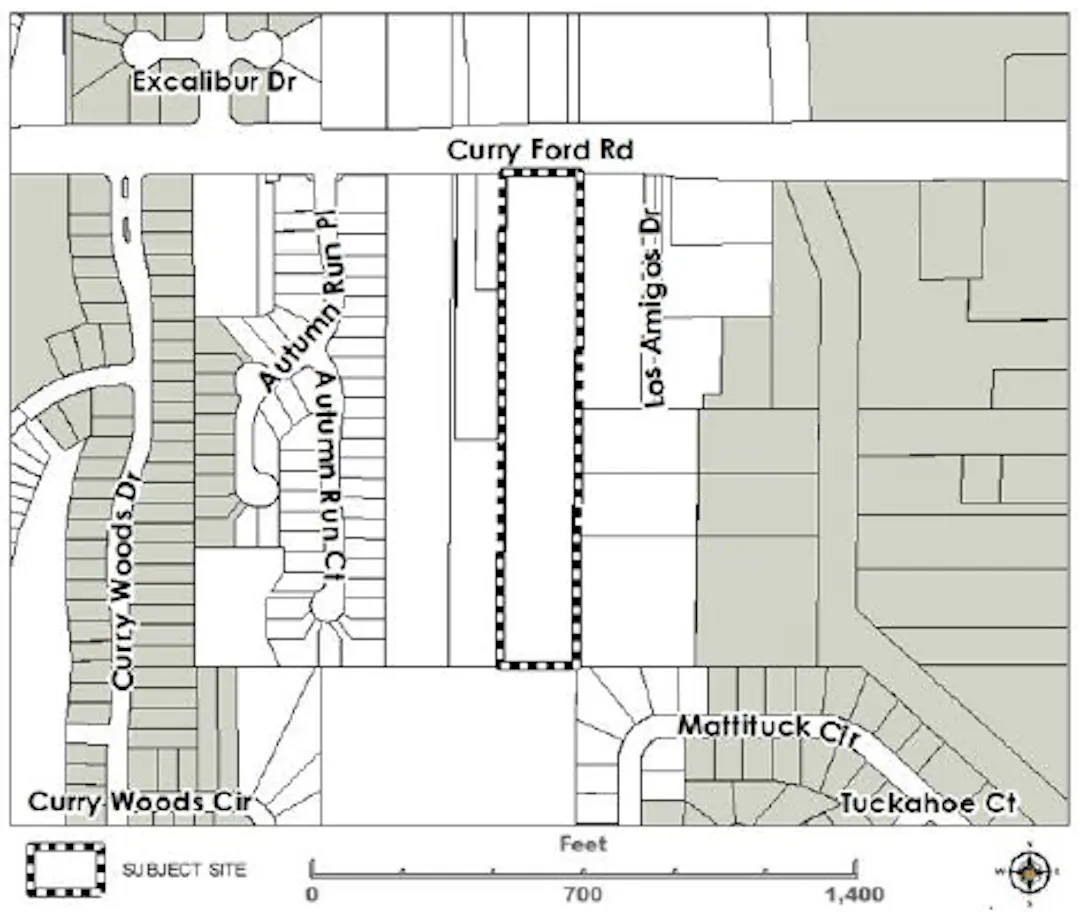 The property is located in District 3 at 8224 Curry Ford Road; generally located north of Pinar Elementary School, south of Curry Ford Road, east of Autumn Run Place, and west of Los Amigos Drive.